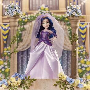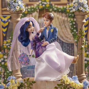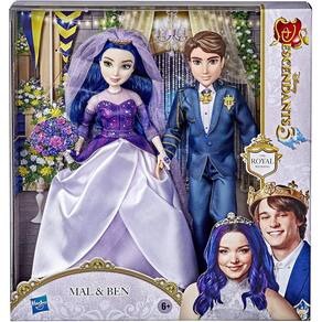 As crianças podem imaginar trazer para casa seu casal favorito com este pacote de 2 bonecas de moda Mal e Ben, inspirados em seus personagens na Disney The Royal Wedding: A Descendants Story. Mal é uma noiva o e bonita, usando um vestido de comprimento de chão adequado para a Rainha de Auradon. Toda noiva precisa de acessórios para fazê-los se destacar em seu dia especial, e Mal não é exceção. Ela inclui um par de saltos dourados, inspirados em dragão e seu anel de noivado. Ela também usa uma coroa com um véu saindo dela. Na verdadeira moda Mal, o vestido de noiva desta boneca inclui toques roxos (e ela ainda usa sua luva roxa pintada em uma mão). O boneco Ben arrasa em seu próprio estilo em um terno azul com toques dourados, incluindo uma crista de ouro da na jaqueta, e um par de sapatos pretos.