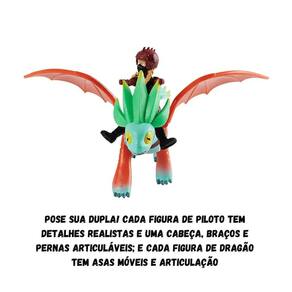 Pose sua dupla! Cada figura de piloto tem detalhes realistas e uma cabeça, braços e pernas articuláveis; e cada figura de dragão tem asas móveis e articulação. Cada dragão único vem com suas próprias características especiais! Pressione a cauda para ativar movimentos emocionantes!