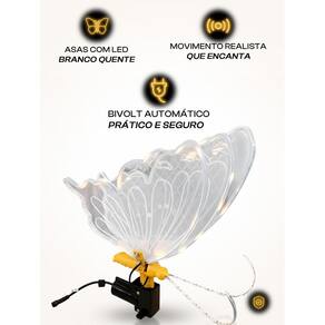 A Borboleta LED com Movimento foi projetada para ser o destaque da sua decoração. Com 40cm de largura, ela possui asas transparentes e iluminadas com LEDs de luz branca quente amarelada , que criam um efeito visual acolhedor e luxuoso.