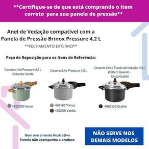 Anel de vedação compatível com a panela brinox pressure 4,2 l - 20 cm Nosso empenho é procurar o que há de mais atual e funcional no mundo culinário e para organização da sua casa, priorizando sempre a qualidade e a versatilidade dos produtos. Pensando nisso, apresentamos o anel de vedação compatível com a panela brinox pressure 4,2 l - 20 cm, a peça essencial para manter sua panela segura, eficiente e com desempenho de fábrica. Características técnicas - material: silicone 100% atóxico e resistente ao calor - diâmetro interno: 20 cm - diâmetro externo: 22 cm - marca: guamantec Benefícios diretos - vedação total para mais segurança e eficiência no cozimento - alta durabilidade, não resseca com facilidade - fácil de instalar e limpar - mantém sua panela funcionando como nova - compatível exclusivamente com os modelos brinox pressure 4,2 l Compatibilidade Indicado para os seguintes modelos brinox: - ceramic life pressure 4,2 l botanika verde - 4952108 - ceramic life pressure 4,2 l cinza - 4951207 - ceramic life pressure 4,2 l vanilla - 4952101 - ceramic life e fundo de indução 4,2 l 20cm granito - cinza grafite - 4952109 Importante: não compatível com outros tamanhos ou modelos da brinox. Conteúdo da embalagem 1 anel de vedação compatível com a panela de presssão brinox pressure 4,2 l - 20 cm Dona li utilidades - praticidade para o seu dia a dia do vendedor contra defeitos de fabricação. Gostou Garanta já o seu anel de vedação e cozinhe com muito mais tranquilidade e segurança Marca: Não Informado