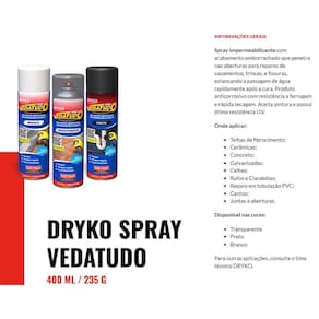Preparação da superfície A superfície para aplicação do dryko spray impermeabilizante vedatudo deve ser limpa e isenta de pó, materiais soltos, óleos e restos de produtos impregnantes. Para superfícies de pvc, plásticos e similares, recomendamos realizar lixamento prévio.