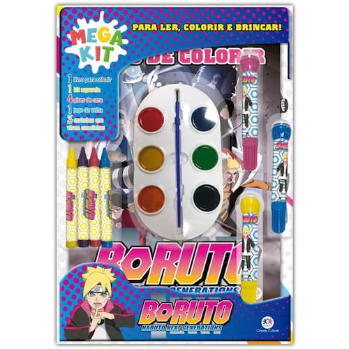 Prepare-se para muita diversão na companhia de Boruto e sua turma. Neste megakit ninja, há um livro dos personagens para colorir, gizes de cera, aquarelas, canetinhas com carimbos, além de um jogo para recortar e brincar! Contém: 1 - Livro 3 - Canet inhas com Carimbo 4 - Gizes de cera 1 - Estojo com 6 aquarelas. Como usar as aquarelas? Passo 1: Molhe o pincel com um pouco de água. Passo 2: Passe o pincel na tinta da cor escolhida. Passo3: Passe o pincel na página para ver as cores em aquarel a.