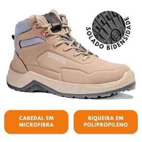 Calçado ocupacional tipo tênis, cano alto, confeccionado em microfibra e tecido dupla frontura, com forração em nylon e biqueira de polipropileno. Solado bidensidade em PU, resistência ao escorregamento (SRC) e absorção de impacto (E). Com fechamento em cadarço ilhós tipo gorgurão retro refletivo e passador plástico de alta resistência.