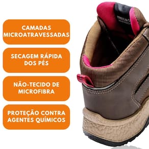Calçado ocupacional (OB), com fechamento em cadarço, cabedal confeccionado em microfibra e nylon Ripstop, ilhós tipo gorgorão retro refletivo e passador plástico de alta resistência, puxador em microfibra com retro refletivo, forração interna do cano, colarinho e lingueta em nylon com espuma de conforto, com contraforte em termoplástico, forração da gáspea em não tecido.