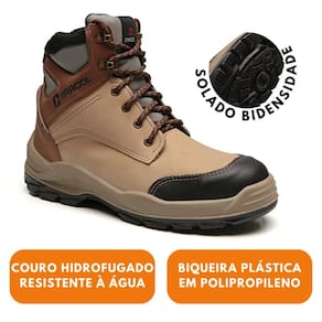 Botina para uso ocupacional de amarrar cano acolchoado, língua semi fole, confeccionada em vaqueta crazy horse areia, com forração interna na gáspea em não tecido e forro do cano em nylon com excelente poder de absorção de suor, com biqueira plástica, palmilha montagem em não tecido, sobrepalmilha de poliuretano 8mm, solado de poliuretano injeção direta bidensidade bicolor e estabilizador de caminhada, feito em PP, que reduz o risco de torção.