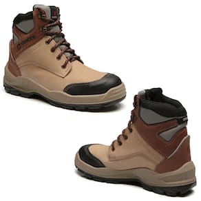 Bota para uso ocupacional com fechamento em cadarço e confeccionada em vaqueta crazy horse areia. Forração interna na gáspea e forro do cano em nylon com excelente absorção de suor e solado poliuretano (PU) bidensidade e estabilizador de caminhada.