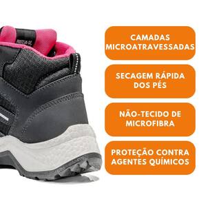 Informações Técnicas Marca: Bracol Modelo: Ella Ametista Material: Microfibra e nylon ripstop, com forração em nylon Bico: Polipropileno Palmilha: Não tecido, costurada pelo sistema strobel, 8,5mm na região calcânea e 3,5 na região plantar Solado: Bidensidade em PU injetado diretamente ao cabedal Cabenal: Microfibra e nylon ripstop, forração interna da gáspea e cano em nylon Tecnologias: Airtech, Fribratec CA: 42307 Peso: 0,175 kg