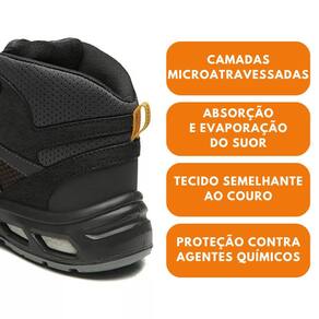 Calçado ocupacional tipo tênis, cano alto, confeccionado em microfibra e napa soft, com forração em tecido absorvente e biqueira de polipropileno. Solado tridensidade em PU, resistência ao escorregamento (SRC) e absorção de impacto (E).