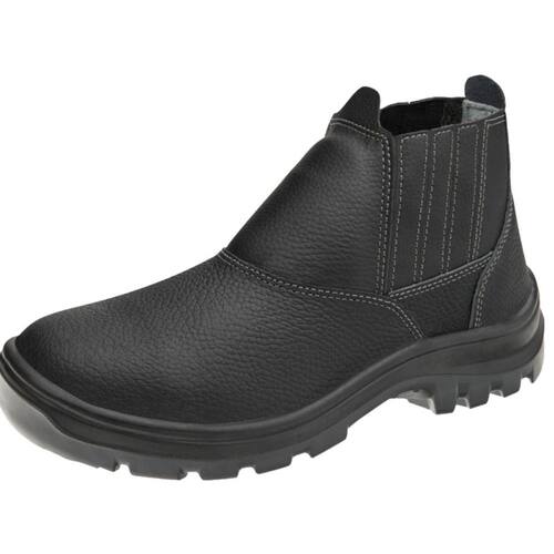A Botina Vulcaflex é confeccionada em couro relax preto com fechamento em elástico lateral e dorso acolchoado. Sua biqueira de aço oferece proteção contra quedas de objetos, e o solado em PU bidensidade, injetado diretamente no cabedal, garante absorção de impacto.
