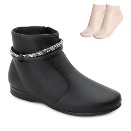 Para um visual elegante e cheio de charme, a Bota Cano Curto Beira Rio é a escolha certa! Com acabamento impecável, ela se destaca pelas tiras decorativas, uma com material alternativo e outra com aplicação de strass que dão um toque de brilho e sofisticação ao look. O zíper lateral garante praticidade no calce, enquanto a palmilha macia e o forro têxtil oferecem conforto durante todo o dia. O solado de borracha antiderrapante proporciona segurança a cada passo. E o melhor: acompanha um par de meias finas, ideal para compor produções elegantes em qualquer ocasião.