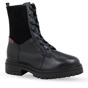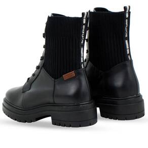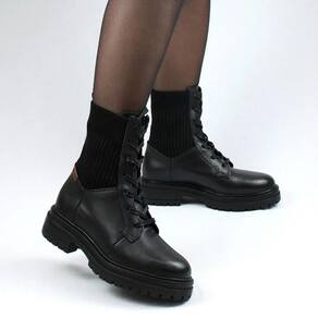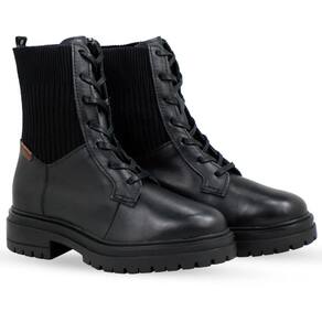 Bota coturno em couro atanado napoli preto. De salto tratorado preto. O modelo possui fechamento em cadarços preto e malha nas laterais, trazendo conforto e estilo.