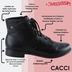 A bota possui salto baixo com 2,5 cm, que garante conforto durante todo o dia, e cadarço de amarrar para um ajuste perfeito. O material sintético Premium é leve e durável, e os detalhes tramados no cano trazem um toque moderno e atemporal. Além disso, o modelo possui altura do cano de 11 cm e circunferência de 22 cm.