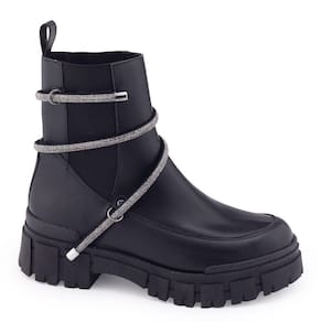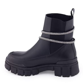 A Bota Chelsea feminina Tratorada da M. Rose 543-705 é um modelo de Coturno confortável, ideal para o dia a dia ou passeios. O cabedal é confeccionado em material sintético e vai te ajudar a compor lindos looks nessa mudança de estação, a bota é forrada internamente proporcionando conforto e a palmilha fixa é macia e revestida. Tem como detalhe uma tira de strass afixada com tiras aderentes e removível, para facilitar o calçe possui elástico nas duas laterais. No solado, possui um salto médio em bloco plataforma, com 5cm de altura traseiro e 3,5cm de altura frontal tratorado e emborrachado.