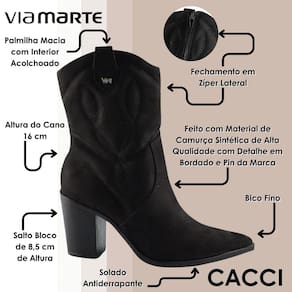 A bota country feminina da Via Marte é a escolha ideal para quem busca um calçado que una presença marcante, conforto absoluto e acabamento de alto padrão. Seu design é inspirado no estilo western, trazendo bordado no cabedal de camurça sintética e com seu pin da marca, detalhes que enriquecem o visual sem exageros. O cano com de 16 cm oferece o equilíbrio perfeito entre modernidade e praticidade, garantindo um caimento elegante tanto com roupas ajustadas quanto com peças mais amplas. Seu acabamento suave e o visual sofisticado combinam com diversas ocasiões e estilos.
