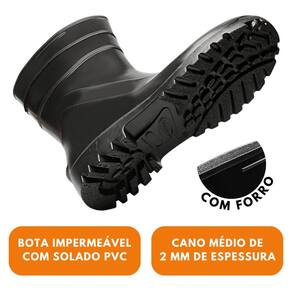 Bota impermeável ocupacional em PVC linha acqua flex, cano médio com espessura de 2mm e estrias laterais que facilitam o calce e estria no calcanhar para descalce. Confeccionada em policloreto de vinila (PVC), com adição de massa nitrílica proporcionando melhor resistência a abrasão, ressecamento e trincas, com forro e sem biqueira, solado PVC reforçado com massa nitrílica.