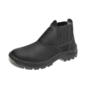 Bota de segurança confeccionada em couro com curtimento através do, 1,8/2,0 mm linhas de espessura, fechamento em elástico, forração em tecido não tecido transpirável, palmilha de montagem em E.V.A fixada/costurada junto ao cabedal (processo Strobel).