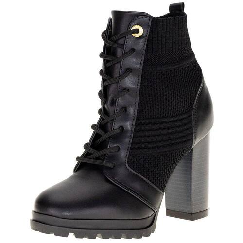 A Bota Feminina Coturno Vizzano é confeccionada em Tecido Knit e Napa com fechamento por cadarço, acabamento em costura, forro interno em têxtil, palmilha em PU e solado em borracha com salto grosso de onze centímetros. Esse modelo possui cano de treze centímetros de altura por trinta centímetros de circunferência.