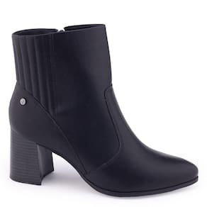 Bota Feminina 23-95121 é um modelo clássico tem cabedal fabricado em material sintético liso com detalhe em costuras. É um modelo confortável, apresenta um bico afinado e fechamento por zíper na lateral interna. Toda forrada internamente, sua palmilha é fixa, macia e revestida em material têxtil apresentando a logo da marca. O salto bloco em formato geométrico, possui aproximadamente 6,5cm de altura com acabamento fachetado, é confortável e traz segurança ao caminhar. Seu solado possui frisos para maior segurança.