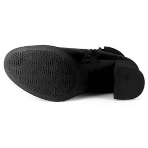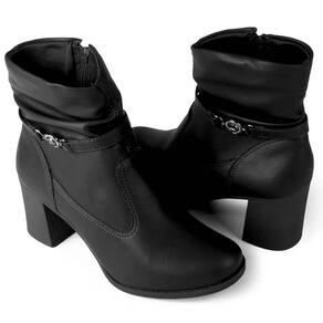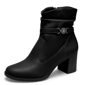 O cano, com 16 cm de altura e 26 cm de circunferência, possui um efeito amassado que confere um toque moderno e despojado ao visual. A tira decorativa com aplicação metalizada complementa o design com uma pitada de brilho sutil, tornando a bota ainda mais charmosa. O salto bloco alto de 7 cm oferece a elevação ideal para alongar a silhueta com estabilidade e conforto durante todo o dia. Abertura lateral discreta proporciona praticidade na hora de calçar, sem comprometer o visual limpo e elegante do modelo.