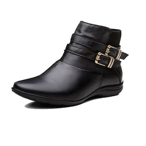 Bota Flat em Couro Feminino Rasteira Zíper Elástico Atrás Fivela Confortável - 38 - Preto