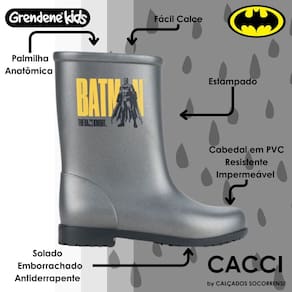 Imagina só, pequenos heróis enfrentando os dias chuvosos com estilo! A galocha Batman Rain Fun é como um acessório direto da Batcaverna para os pezinhos das crianças. Com um acabamento fosco que faz jus ao espírito sombrio do Cavaleiro das Trevas, essas galochas são verdadeiras obras-primas de contraste, com solas vibrantes contrastando com o cano escuro. Mas a diversão não para por aí! Cada par vem com uma capa que é mais do que uma simples proteção contra a chuva, é uma fantasia completa do herói, com detalhes 3D como as orelhas do Batman, garantindo que cada passo seja uma aventura épica.
