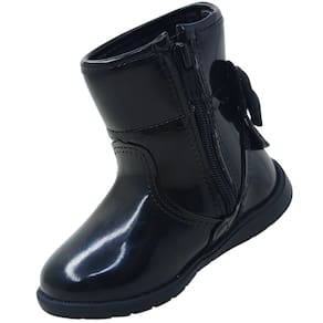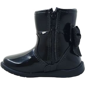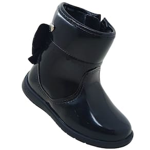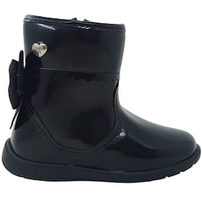 Bota infantil feminina confeccionada em material sintético com acabamento em verniz preto brilhante, conferindo um visual moderno e elegante. O modelo possui cano baixo com aproximadamente 10cm de altura e circunferência de 22 cm, ajustando-se perfeitamente ao tornozelo. O destaque fica por conta do delicado laço em camurça sintética na parte de trás em contraste com o brilho do verniz, além do detalhe em metal prateado em formato de coração, que reforça a logo da marca do calçado.