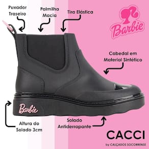 Prepare-se para um visual cheio de estilo e diversão com esta incrível bota estilo chelsea. Com sola robusta e moderna, tratorado e detalhes volumosos com o logo da Barbie, esta bota não só é um arraso, mas também oferece praticidade com seu elástico costurado no cano, garantindo um ajuste perfeito para os pezinhos.