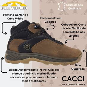 A Bota Bull Terrier Explorer Castanho é a parceira ideal para quem ama trilhas, caminhadas em terrenos desafiadores e até mesmo para quem curte um visual aventureiro no dia a dia. Com um design robusto e cheio de personalidade, ela combina resistência, segurança e aquele toque de conforto que faz toda a diferença em longas jornadas.