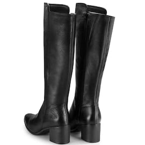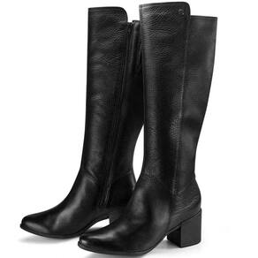 Bota de cano longo em couro burnish preto, de salto médio com solado preto. Possui fechamento prático em toda a lateral interna. Modelo resistente e confortável, tem tudo para ser a estrela do seu inverno, essa bota garante uma qualidade sem igual e se torna uma daquelas peças que acompanham o guarda roupa por tempos. O design ainda que cheio de presença também é minimalista o que facilita a composição das produções e torna a rotina mais prática.