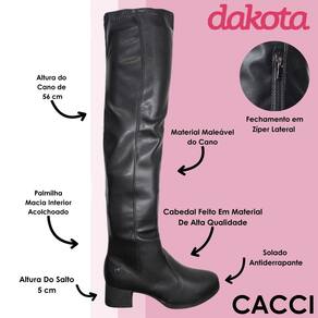 O cano de 56 cm de altura com 23 cm de circunferência conta com material maleável que facilita o calce e proporciona um ajuste firme e confortável, além de seu fechamento prático la lateral fazendo com que se encaixe perfeitamente. Já o salto bloco de 5 cm oferece estabilidade e estilo em cada passo.