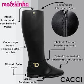 A Bota Molekinha Cano Alto Juvenil Menina Fivela 2181.104 apresenta cabedal em material sintético resistente, com detalhe de fivela para um toque de estilo. Seu bico é arredondado, oferecendo conforto aos pés. O fechamento é por zíper lateral, proporcionando praticidade no calce. Com construção sólida, possui altura do cano até o joelho. O salto é baixo 3,0 cm e robusto, tipo plano. A palmilha é macia e a calcanheira acolchoada para conforto extra. O forro interior é em material têxtil, oferecendo respirabilidade. O solado é de borracha, proporcionando aderência. Com estilo juvenil e design moderno, é ideal para complementar looks casuais ou despojados com um toque de moda.