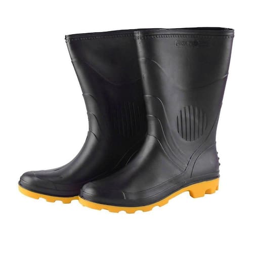 Bota PEGAFORTE de PVC Cano Médio Preta com Solado Amarelo com Forro - CA 3151 Calçado ocupacional tipo bota, cano médio, confeccionado em PVC injetado na cor preta e impermeável com solado amarelo. Bota forrada em nylon texturizada. Indicada para proteção dos pés dos usuários contra riscos de natureza leve e contra umidade proveniente de operações com uso de água.