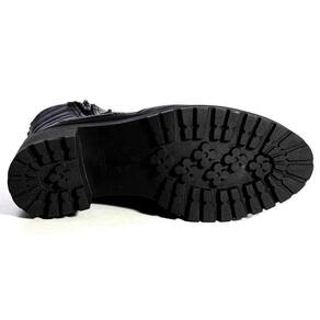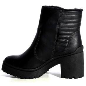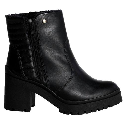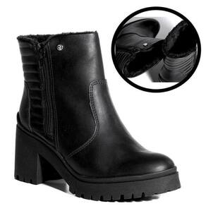 * Cabedal é fabricado em sintético;* Forro em têxtil;* Fechamento por zíper;* Palmilha fixa em têxtil aveludado e espuma;* Bico redondo;* Solado em PVC, contém frisos antiderrapantes;* O salto mede 7,5cm, altura do cano de 12,5cm e circunferência do cano 29cm;