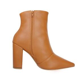Linha de Bota Salto Alto Grosso Luiza Sobreira, cano curto, bico fino e zíper na lateral interna. Produzida em material sintético na cor Caramelo, com palmilha e forro em P.U., solado em TR.