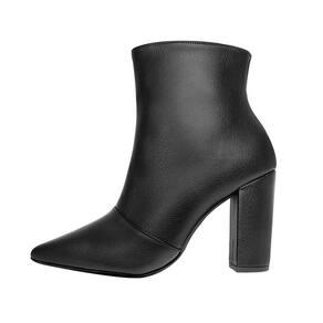 Linha de Bota Salto Alto Grosso Luiza Sobreira, cano curto, bico fino e zíper na lateral interna. Produzida em material sintético na cor Preta, com palmilha e forro em P.U., solado em TR.