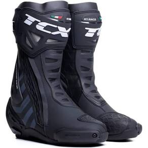 Principais características da Bota TCX RT-Race Sistema Double Flex Control (Duplo Controle de Dobramento): uma inovação TCX, oferece flexibilidade sem abrir mão da segurança, com estrutura em poliuretano presa por dois parafusos no calcanhar, absorvendo impactos e evitando torções exageradas. Raspadores (sliders) nos pontos estratégicos: frontal em poliuretano para resistência e traseiro em magnésio para máxima leveza e capacidade de deslize durante um eventual contato com o asfalto. Construção premium em couro e camurça, garantindo a alta resistência à abrasão, proteção extra nas quedas e isolamento térmico contra o calor do motor.