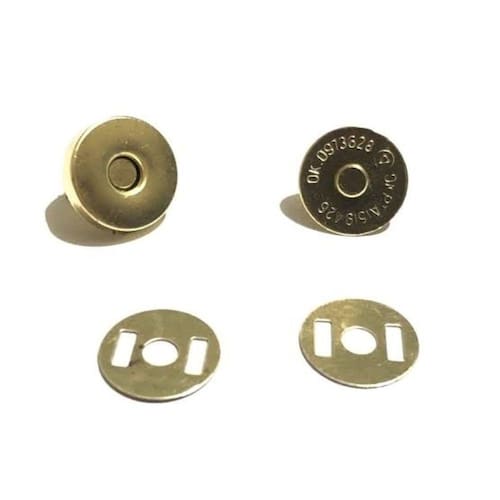 Botão Imã 18 mm para Bolsas Dourado - Kit com 10 UnidadesBotão imã para bolsas, carteiras, mochilas e entre outras aplicações.OBS: O botão imã simples não tem matriz por conta das " perninhas " que o produto apresenta para fixar diretamente no tecido.DADOS TÉCNICOS:Quantidade: 10 UnidadesDiâmetro: 18 mmComposição: 100% Ferro Marca: Loja Malu