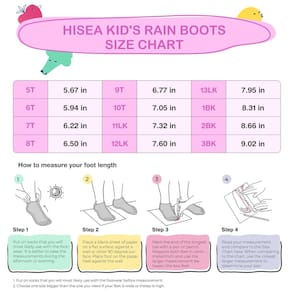 HISEA Botas de chuva infantis para meninos e meninas, botas de borracha à prova d'água com alças fáceis de colocar, botas de chuva de PVC sem costura, sapatos de lama leves para brincar ao ar livre - À prova d'água e sem costura – o material de PVC e a estrutura sem costura evitam rasgos e vazamentos, garante que a água não penetre nas botas. O forro sintético macio absorve a umidade e seca rapidamente. O design até o meio da panturrilha mantém os pés secos e quentes depois de brincar o dia todo na chuva, riachos, poças e jardim onde quer que fique lamacento. - Alça fácil de colocar – Duas alças resistentes na parte superior para facilitar o transporte e o armazenamento suspenso, facilitam para seus filhos puxarem e tirarem sozinhos. O formato bonito dos dedos redondos oferece espaço suficiente para os pés das crianças, pode ser dobrado de forma flexível, garantindo um ajuste confortável e seguro. Palmilha acolchoada e PVC flexível oferecem maior conforto e suporte. - Antiderrapante e seguro – Solas antiderrapantes duráveis fornecem forte tração e boa aderência em solo molhado, garantem a segurança das crianças quando elas estão correndo, pulando e pisando em dias chuvosos. O revestimento de borracha reforçada adiciona proteção adicional ao dedo do pé e calcanhar. Livre de produtos químicos e materiais nocivos, tornando-os mais seguros para as crianças usarem. - FÁCIL DE LIMPAR - O exterior elegante protege as botas de chuva infantis de manchas e sujeira sem se preocupar com a limpeza fatigante, basta borrifar a lama sob a mangueira ou torneira e elas estarão prontas para a próxima aventura. Adequado para muitas atividades ao ar livre, como acampamento, trilhas lamacentas, escalada, caminhadas, jardinagem, brincadeiras em riachos. - Botas de chuva para todas as estações – as botas de chuva infantis HISEA estão disponíveis em cores populares para meninos e meninas, garantindo uma combinação perfeita com sua personalidade e estilo. Pode ser utilizado em todas as estações e permite que as crianças explorem o ar livre mais livremente e liberem sua inocência infantil, protegendo-as totalmente em estações lamacentas e dias chuvosos. - Problema de tamanho e uso a longo prazo – Leia a tabela de tamanhos e escolha o tamanho certo antes de comprar! À medida que os pés das crianças crescem rapidamente, recomenda-se comprar botas de chuva com tamanho ligeiramente maior. Adicionar uma palmilha extra pode aumentar o conforto a curto prazo e permitir que eles usem as botas de chuva por um longo período.