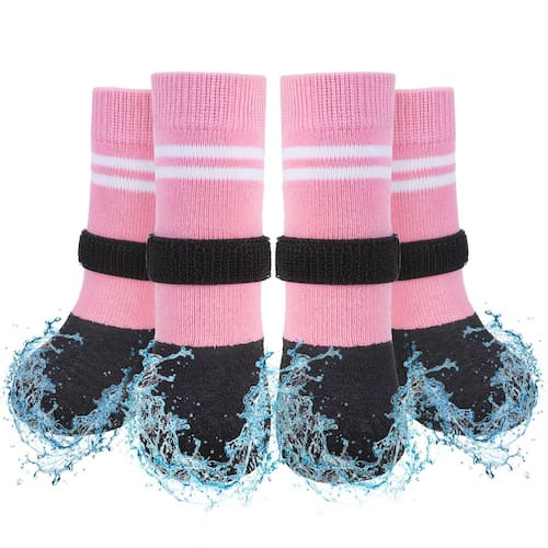 - Meias impermeáveis para cães: as meias para cães são feitas de tecido de algodão macio e aconchegante, usando as meias, os pés do seu cão são instantaneamente envolvidos em calor. O material do piso torna as meias à prova d'água e mantém os pés secos, perfeitas para todas as estações em ambientes internos ou para curtos períodos de exercício ao ar livre