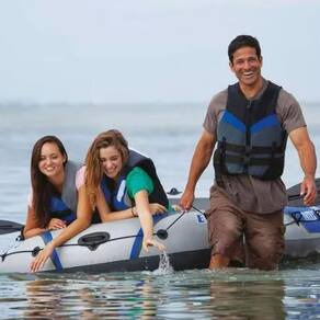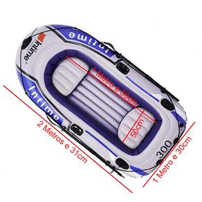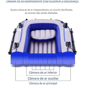 Feito em PVC super resistente, o bote aguenta até 238 kg, comportando confortavelmente 3 pessoas. Seus 2 compartimentos principais no casco garantem estabilidade e segurança durante todo o passeio!
