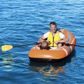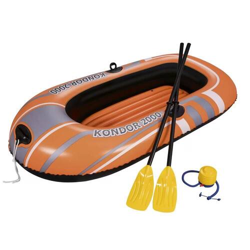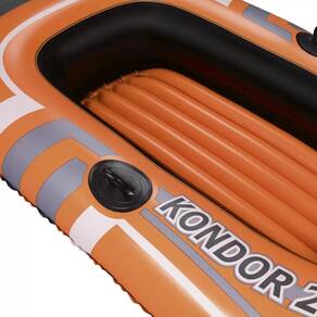 O bote inflável Kondor 2000 da Bestway é um modelo inflável para adultos e crianças! Fabricado em material resistente, ele possui suporte para remos e corda de reboque com olhal integrado. Ele acompanha com exclusividade, um par de remos de 1,24m e uma bomba de pé de 13cm. Fabricado com pegas reforçadas, que trazem maior segurança aos usuários e estrutura devidamente desenhada para suportar com total conforto adultos e crianças, o Kondor 2000 foi fabricado com um pavimento insuflável para conforto adicional. É o modelo de bote ideal para apreciar o mar, rio e piscina com muito estilo e tranquilidade.