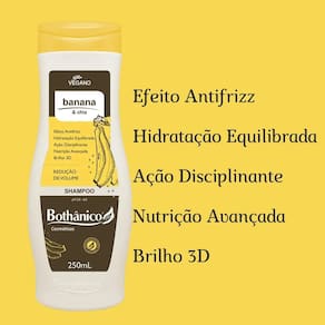 Shampoo Banana E Chia 250ml - Bothânico Hair A Bothânico Cosméticos Desenvolveu a Linha Banana e Chia Vegana, buscando na natureza uma associação imbatível para cuidar dos fios desidratados e indisciplinados. Uma nutritiva combinação entre o extrato obtido da Banana, que é riquíssimo em minerais e vitaminas e a fração da semente de Chia, potente em polissacarídeos com alta capacidade de retenção de água e formação de filme, auxiliando na redução do frizz e do volume. O Shampoo Banana amp; Chia, além de possuir uma fragrância irresistível, limpa delicadamente os fios, conferindo nutrição e um brilho incrível.