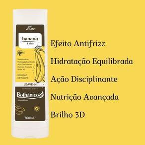 O Leave-in Banana e Chia, além de possuir uma fragrância irresistível, possui ação defrizante, melhorando a penteabilidade dos fios além de deixá-los macios, com brilho, livres de frizz e com menos volume. Oferece proteção térmica contra o calor excessivo do secador e da prancha. Contém filtro solar, oferecendo proteção contra à radiação do sol. A Bothânico Cosméticos desenvolveu a linha Banana e Chia Vegana, buscando na natureza uma associação imbatível para cuidar dos fios desidratados e indisciplinados. Uma nutritiva combinação entre o extrato obtido da banana, que é riquíssimo em minerais e vitaminas e a fração da semente de Chia, potente em polissacarídeos com alta capacidade de retenção de água e formação de filme, auxiliando na redução do frizz e do volume.