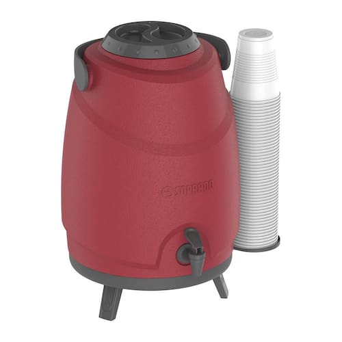 Ideal para o uso corporativo, pois garante maior eficiência térmica e sua litragem é ideal para chás, café e líquidos frios, como sucos e água saborizada para o encontro da família e amigos. Botijão térmico 12 litros, com pés de apoio e porta copos retráteis. Possui torneira prática para servir, alça para transporte e bocal largo para facilitar o abastecimento de gelo ou líquidos quentes e frios. Possui isolamento em poliuretano (PU) e é livre de Bisfenol (BPA Free).