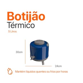 Compacto e fácil de transportar Ideal para uso doméstico, eventos ou ambientes comerciais Torneira prática que evita desperdícios e sujeiras Conserva líquidos quentes ou frios por horas Especificações Técnicas Capacidade: 5,0 litros Peso: 0,83 kg Dimensões: 254 x 290 x 285 mm Material: Isolamento em poliuretano (PU) e peças em plástico injetado Detalhe interessante: o isolamento em PU oferece uma retenção térmica muito superior aos modelos comuns, garantindo mais eficiência para o seu dia a dia.