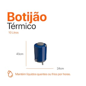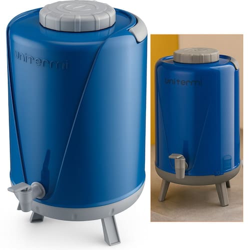 Capacidade de 10 litros Fabricado em polipropileno de alta resistência Cor azul com acabamento fosco moderno Tampa rosqueável com vedação segura Torneira prática para servir com controle de fluxo Pés integrados que garantem firmeza e elevação da base Ideal para eventos, escritórios, refeitórios, comércios e uso doméstico