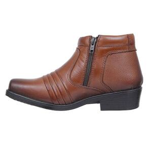 Botina masculina Zebu fabricada em couro na cor Marrom, possui cano curto com zíperes laterais, bico quadrado com detalhes no peito do pé e solado de borracha.