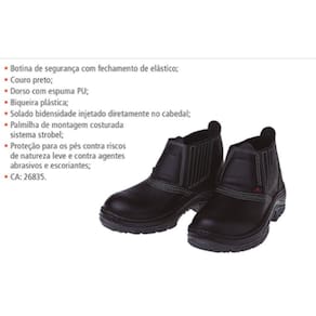 . Botina de segurança com fechamento de elástico; . Couro preto; . Dorso com espuma PU; . Biqueira Plástica; . Solado bidensidade injetado diretamente no cabedal; . Palmilha de montagem costurada sistema strobel; . Proteção para os pés contra riscos de natureza leve e contra agentes abrasivos e escoriantes; . CA: 26835 Ficha técnica - Tipo de calçado de segurança: Botina - Material da sola: Poliuretano - Tipo de calçado: Calçado de segurança - É resistente à água: Sim - Cor principal: Preto - Material do calçado: Couro - Comprimento do pé: 25,6 a 26,1cm - Material do biqueira: Plástico - Certificação: ABNT NBR - Fonte do produto: Par - Resistência do calçado: Abrasão - Gênero: Sem gênero - Tipo de fechamento: Atacadores - Tipo de sola: Flexível