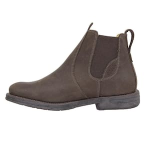 Botina masculina Zebu fabricada em couro na cor Marrom, possui cano curto com elásticos laterais, bico redondo, vira costurada e solado de borracha
