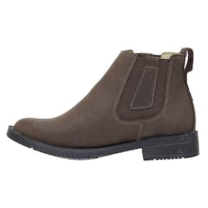 Botina feminina Zebu fabricada em couro na cor Marrom, possui cano curto com elásticos laterais, bico redondo e solado de borracha